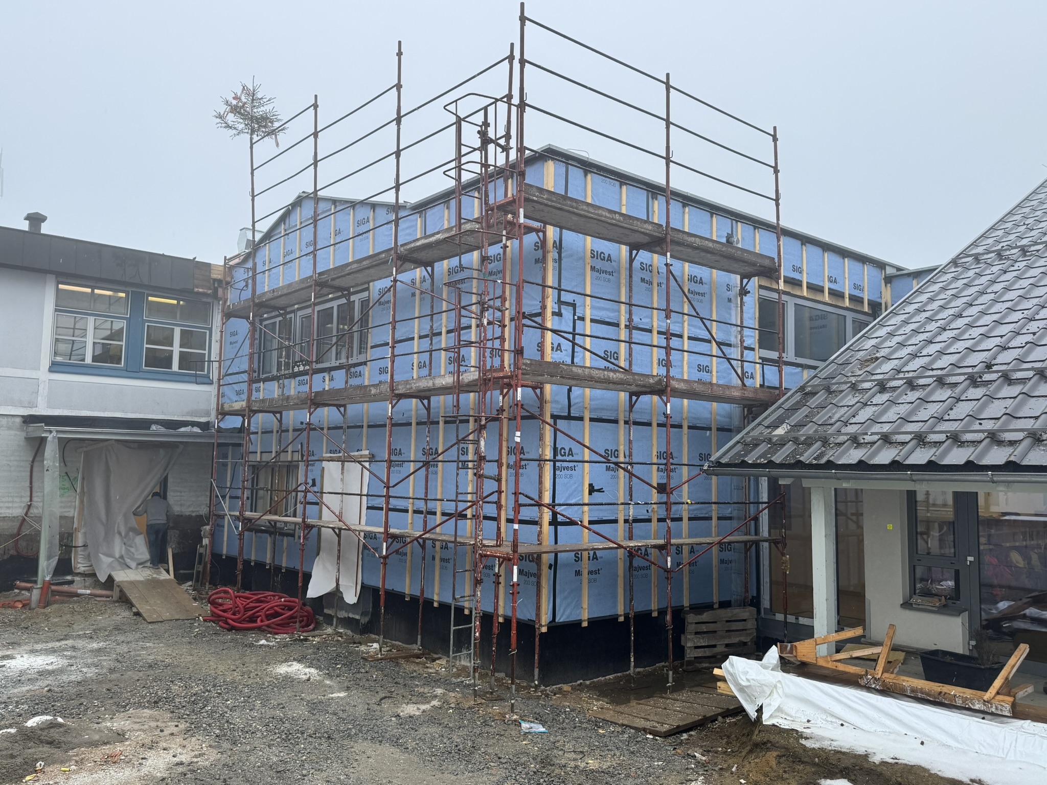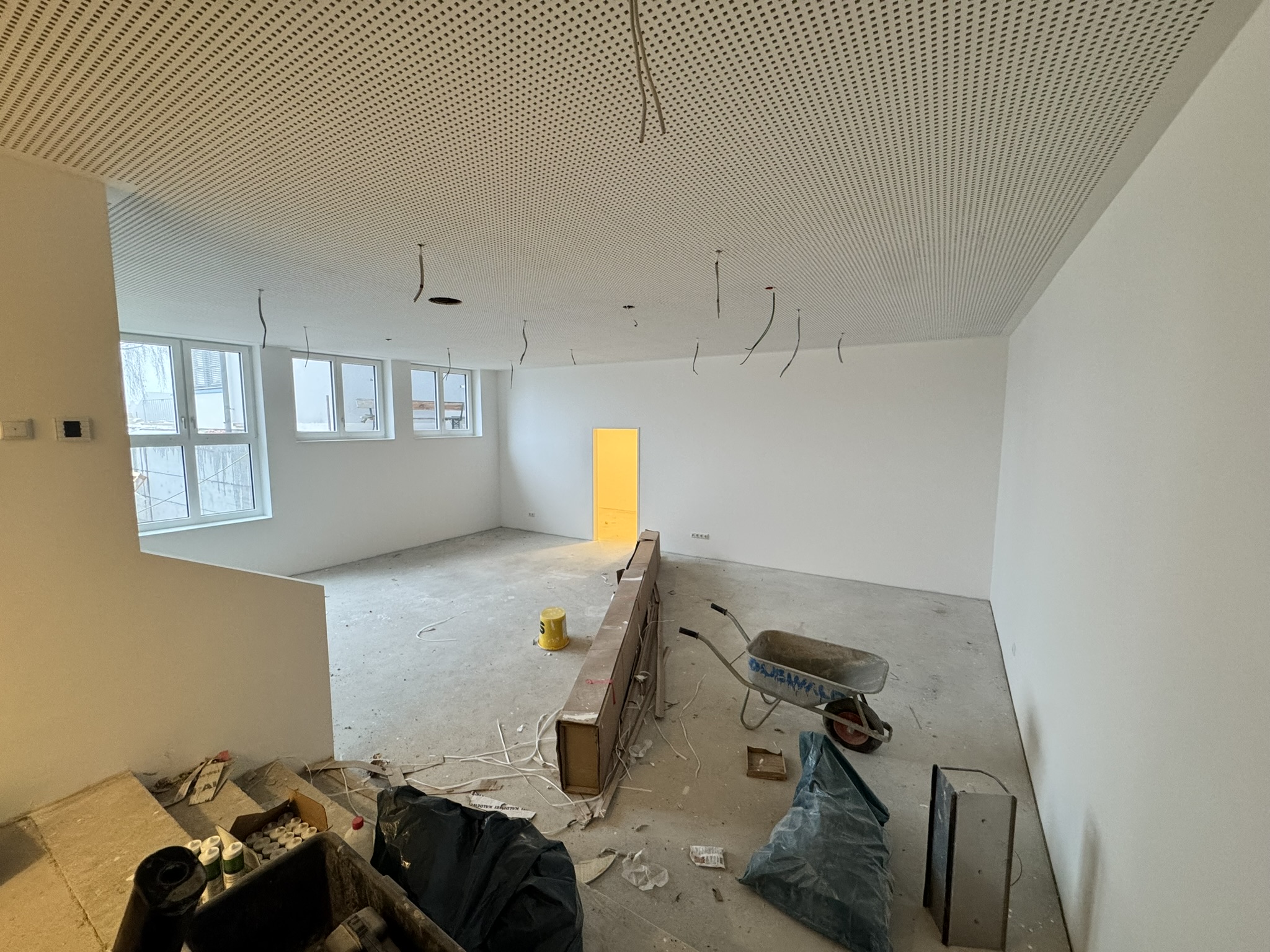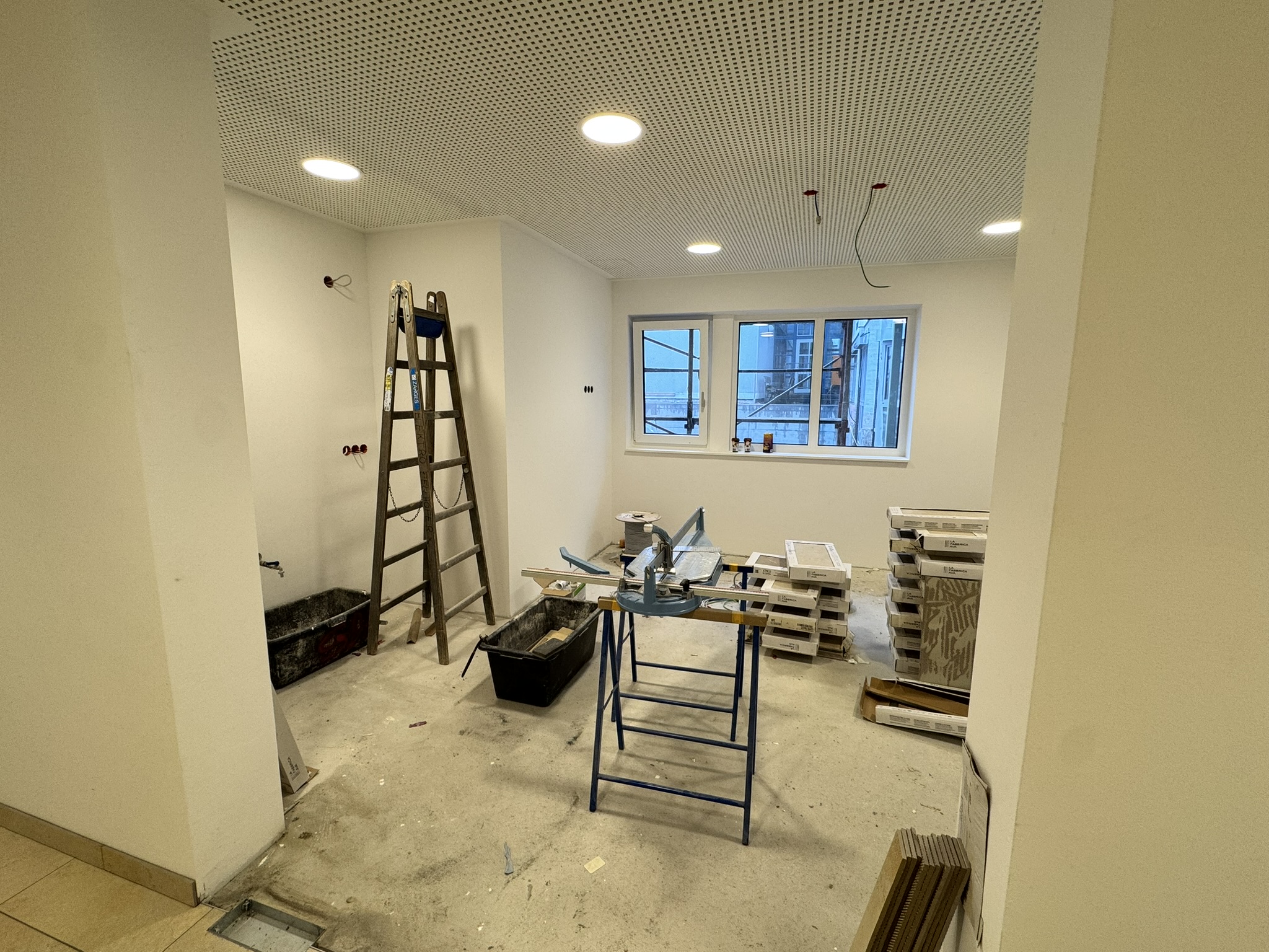 Im Innenbereich sind mittlerweile der Innenputz sowie der Estrich vollständig abgeschlossen. Damit ist eine wichtige Grundlage für die weiteren Ausbauarbeiten geschaffen. Derzeit werden bereits die Fliesen verlegt und die Malerarbeiten durchgeführt, wodurch die neuen Räumlichkeiten zunehmend ihr endgültiges Erscheinungsbild erhalten.